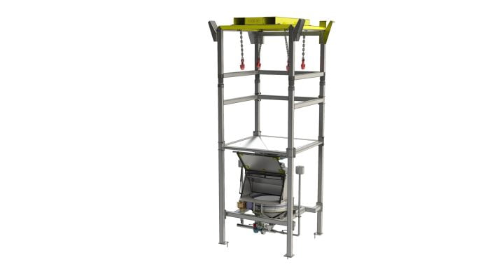 The big bag unloader has various loading options, including electric hoist or spreader bar.
